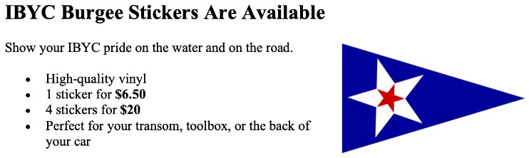 IBYC will host a US Sailing Level 1 Instructor Training Course August 1–3. This “learn to teach sailing” class is for anyone interested in instructing youth or adult sailing. The intensive 3-day course ends with official US Sailing Certification. Full details will be posted on the IBYC Sailing Website.